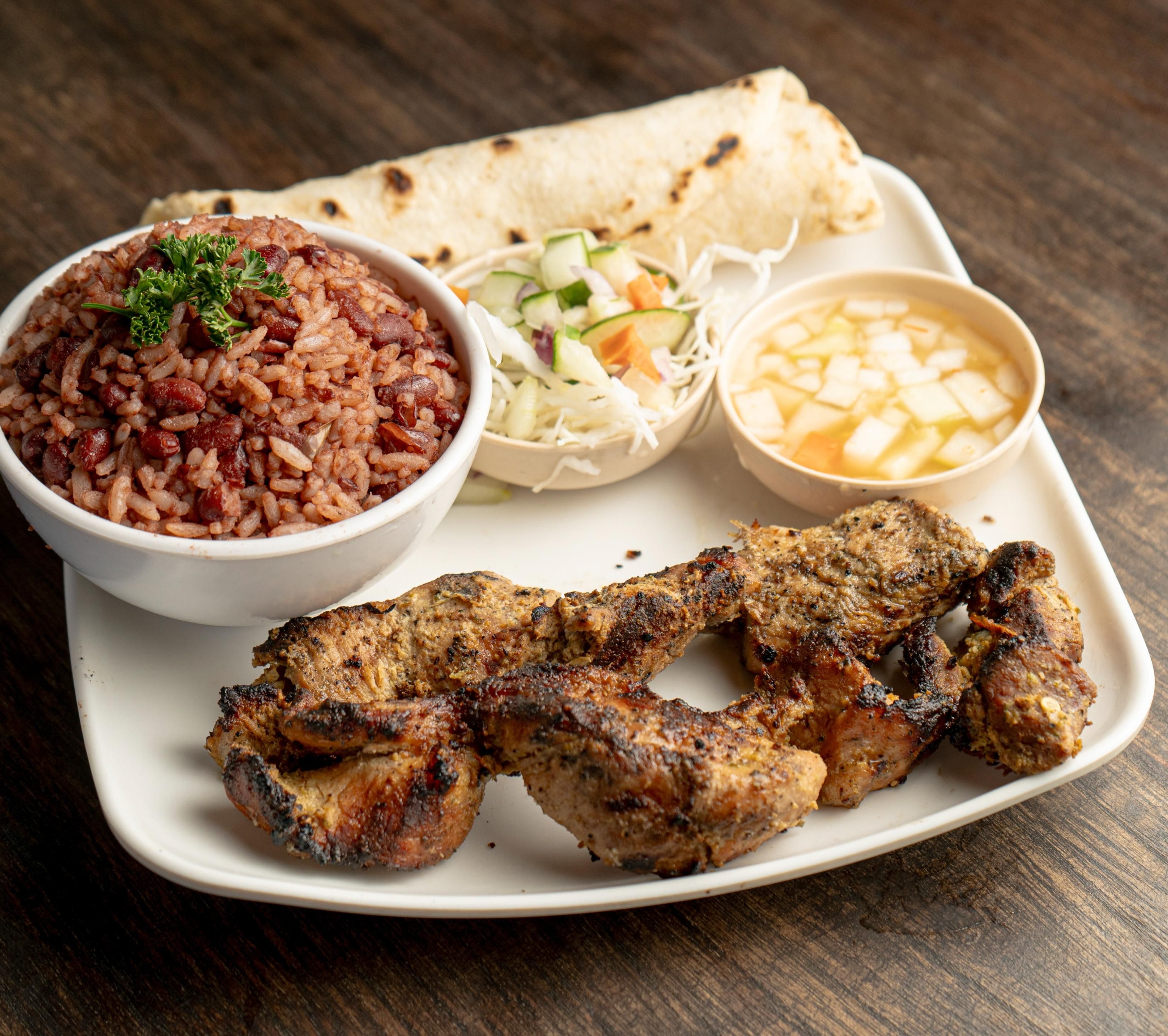 Juicy charcoal-grilled pork with gallo pinto, salad, tortilla, and chili. Traditional Nicaraguan flavor.