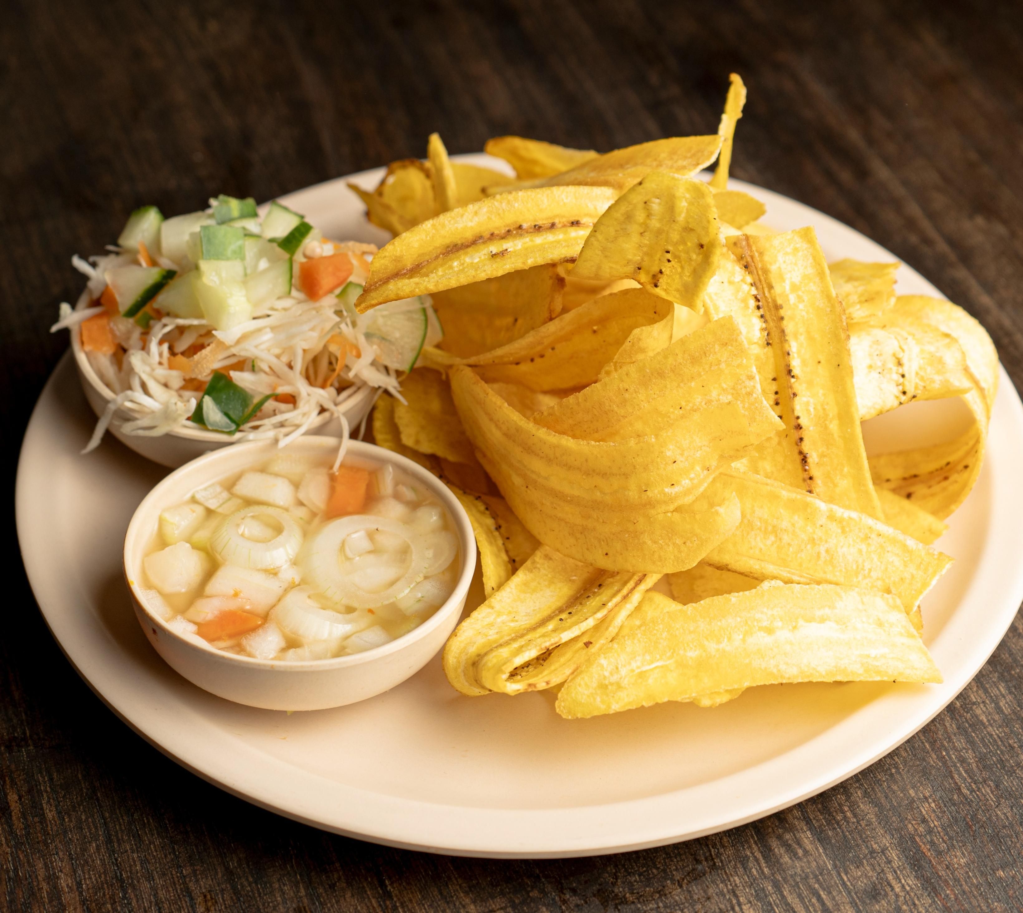 Green plantain sliced and fried until crispy. Large portion for sharing.