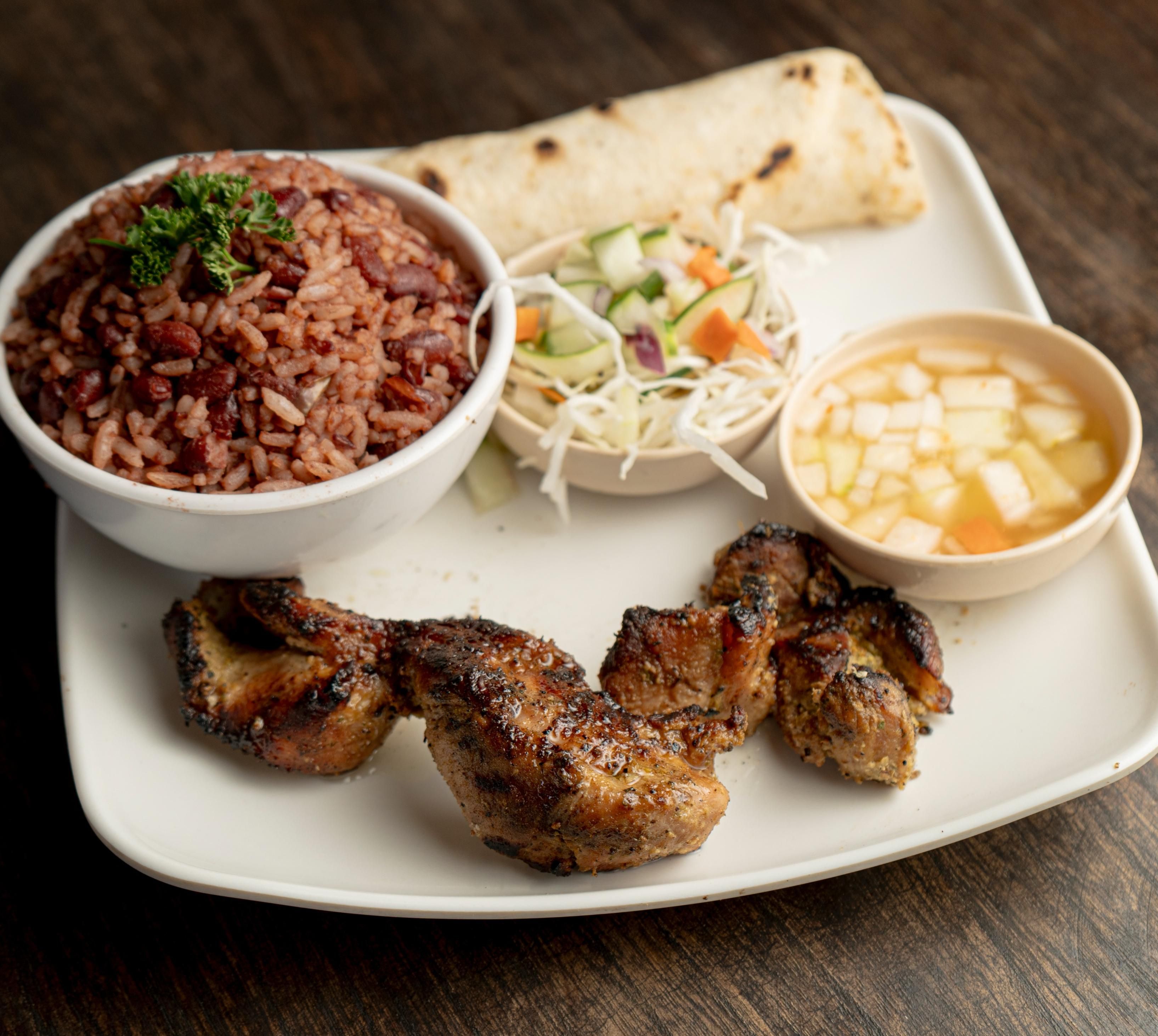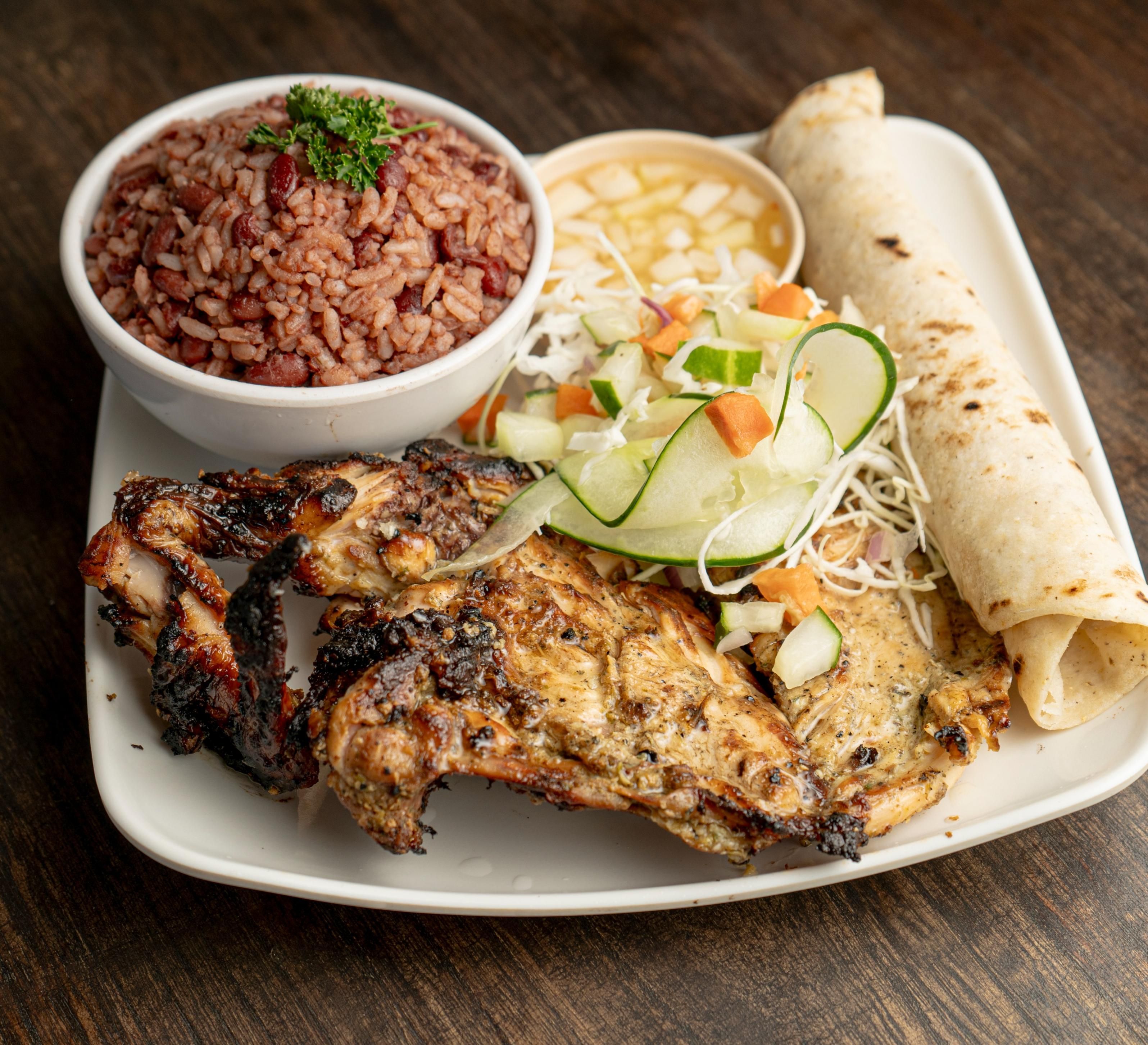 Chicken leg grilled over hot coals, served with gallo pinto, fresh salad, tortilla, and chili.