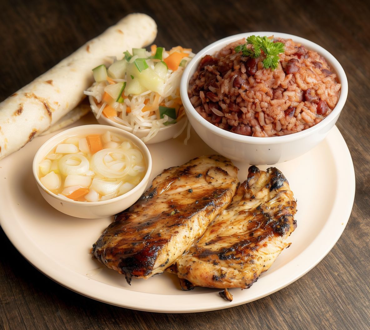 Grilled chicken breast in portions, accompanied by gallo pinto, salad, tortilla, and chili. Perfect portion.